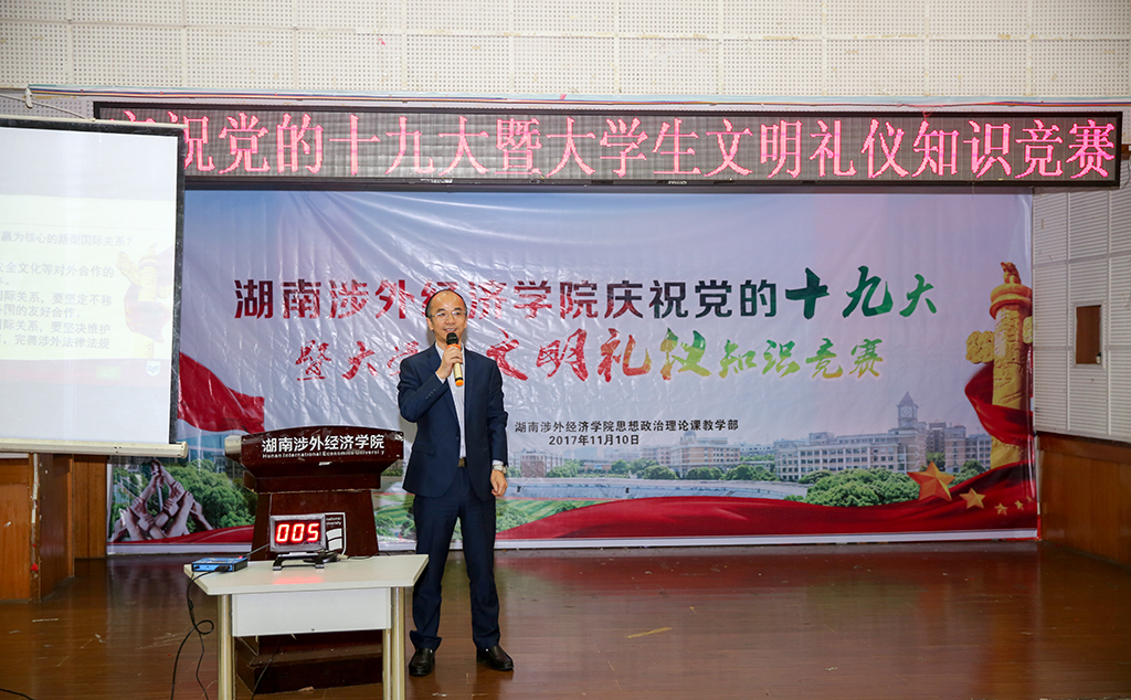 在等待战绩揭晓时,思政部主任李故新代表活动主办方作总结发言,他首先对现场嘉宾和观众表示热烈欢迎,对支持此次活动的单位和个人表达了由衷谢意。他指出,各代表队在赛场上表现不俗,赛出了风格,赛出了水平,此次活动旨在引导同学们学习十九大报告精神,切实在学懂弄通做实上下功夫,进一步丰富我校学生的文化生活,提升学生政治、理论等综合素养,进一步宣传“争做文明大学生”的理念,从而更好地展现我校学子的风采、树立我校形象。他希望通过为大家搭建知识竞赛等活动平台,能够让文明之风吹遍校园,让涉外越来越好,越来越美。他也希望同学们能珍惜时光,努力学习文化知识,学习领会十九大报告精神,做努力奋进的中国人,勇敢担负起历史和时代赋予的使命。