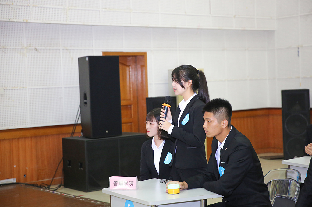 比赛分为必答题、抢答题、风险题和观众互动等环节,知识内容涵盖了党的十九大报告,日常行为礼仪、节庆节俗礼仪、商务社交礼仪以及与大学生相关的法律常识等多个方面的文明礼仪知识。其中以十九大报告内容为主,题目有选择、判断、问答、图画等情景形式,内容丰富多彩,小到日常生活中的交往细节,大到国家外事交往、发展战略,这是对所有参赛选手知识储备量、敏捷度、应变能力和风险意识的一次考验。赛场氛围热烈,场上队员精神抖擞,积极思考、沉稳作答,表现精彩,场下观众也是热情高涨,为选手加油呐喊,互动环节踊跃参与抢答,气氛热烈。特别是风险题更是将大赛推向了高潮,有巅峰对决的氛围。