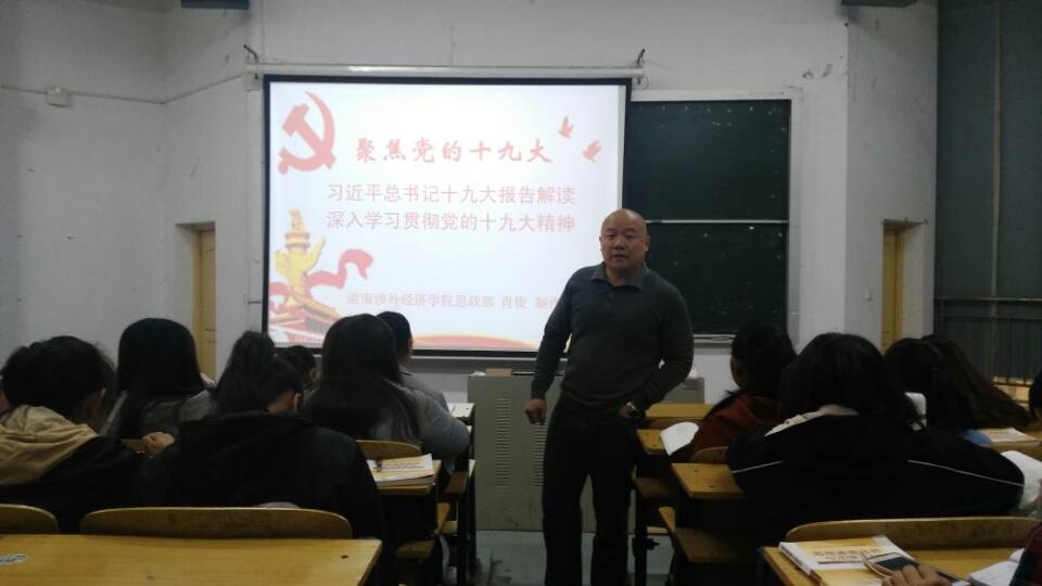 党的十九大刚刚闭幕,我校思政部就掀起了“十九大精神”进课堂的学习热潮。思政部李故新主任组织学部部分教师对十九精神进行了研讨,在此基础上指示教研室统一研发了学习课件,并于10月30日-11月3日之间,将十九大报告学习作为全校学生思政理论课的主要内容,在全校学生中进行为期一周的“十九大报告精神”进课堂的教学活动,着力推进习近平新时代中国特色社会主义思想进教材、进课堂、进学生头脑。